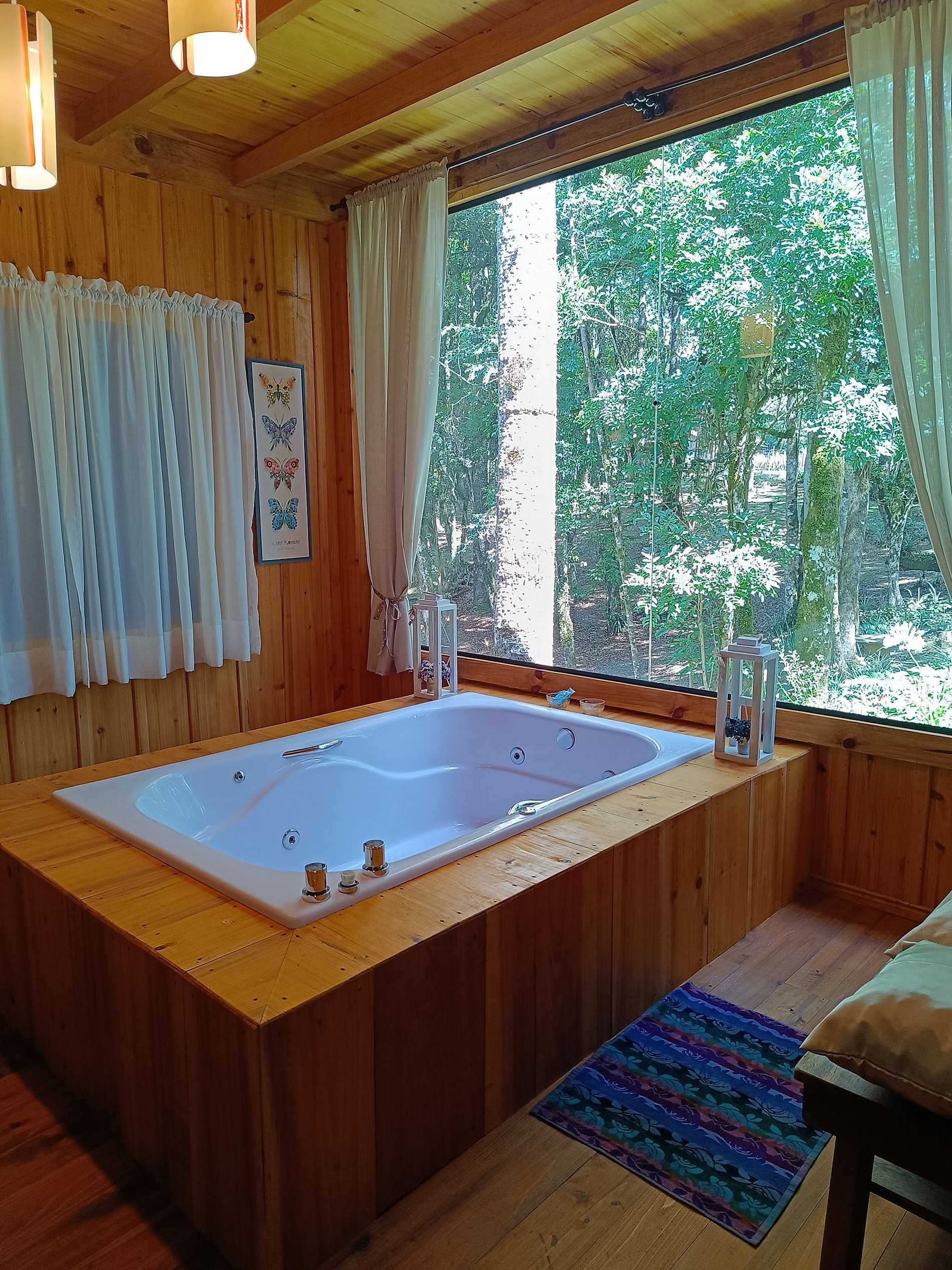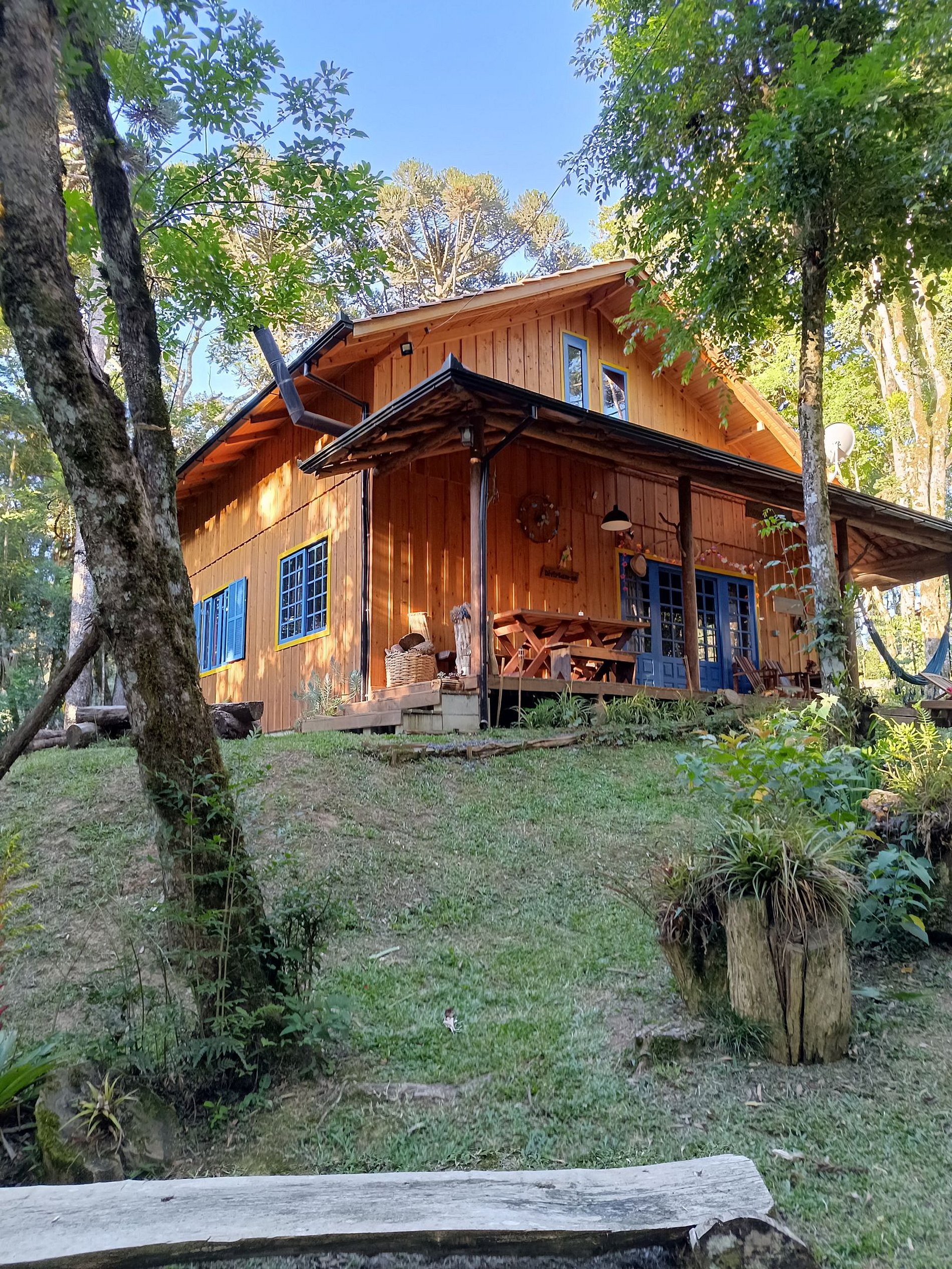 Dois quartos e amplo mesanino. SPA privativo com banheira de hidromassagem. Cozinha completa com churrasqueira e fogão a lenha. Lareira interna e externa. Banheiro completo com ducha a gás e 2 lavabos. Vegetação nativa, araucárias, flora e fauna preservadas. Pomar, balanços, redes, pula-pula, churrasqueira, mesas, áreas para piquenique. Tanque de pesca, pedalinho, bancos, trilhas, casinha na árvore, campinho. Mirante com linda vista para o por do sol.