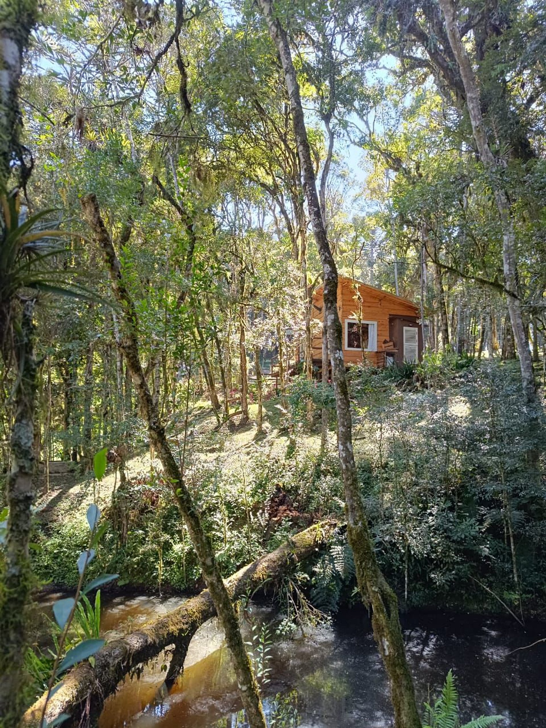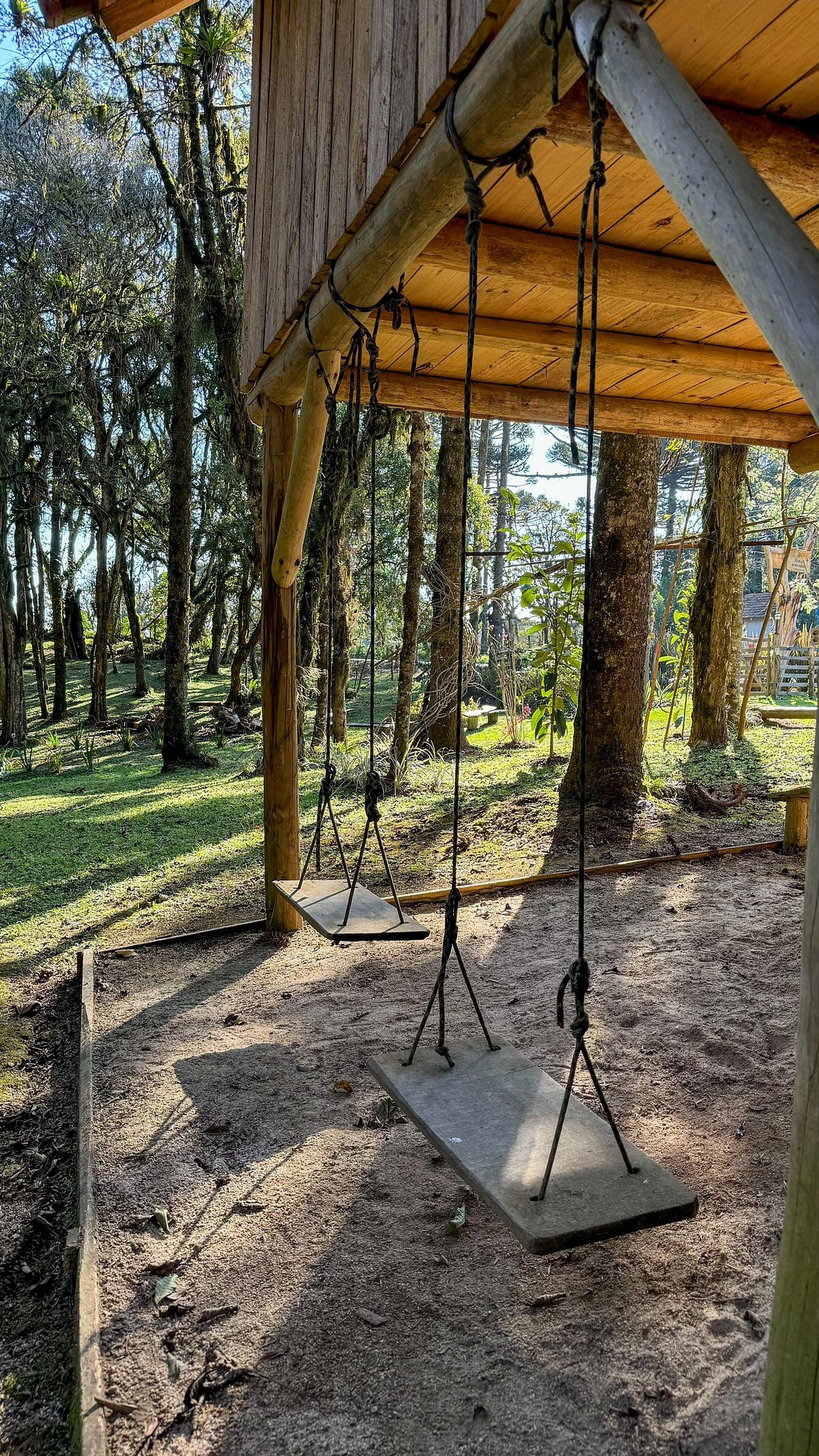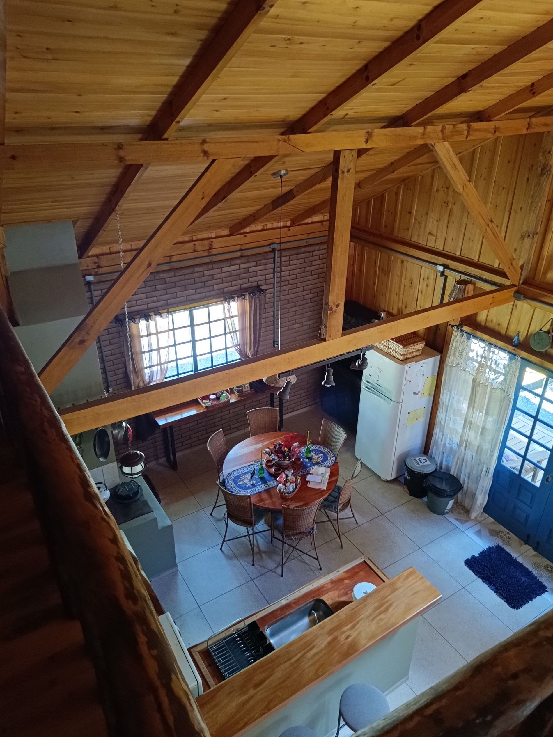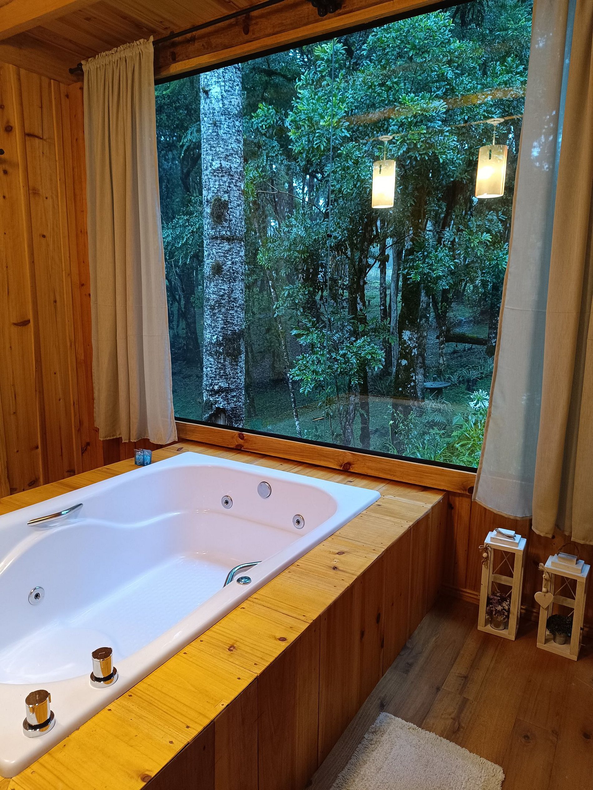 Dois quartos e amplo mesanino. SPA privativo com banheira de hidromassagem. Cozinha completa com churrasqueira e fogão a lenha. Lareira interna e externa. Banheiro completo com ducha a gás e 2 lavabos. Vegetação nativa, araucárias, flora e fauna preservadas. Pomar, balanços, redes, pula-pula, churrasqueira, mesas, áreas para piquenique. Tanque de pesca, pedalinho, bancos, trilhas, casinha na árvore, campinho. Mirante com linda vista para o por do sol.