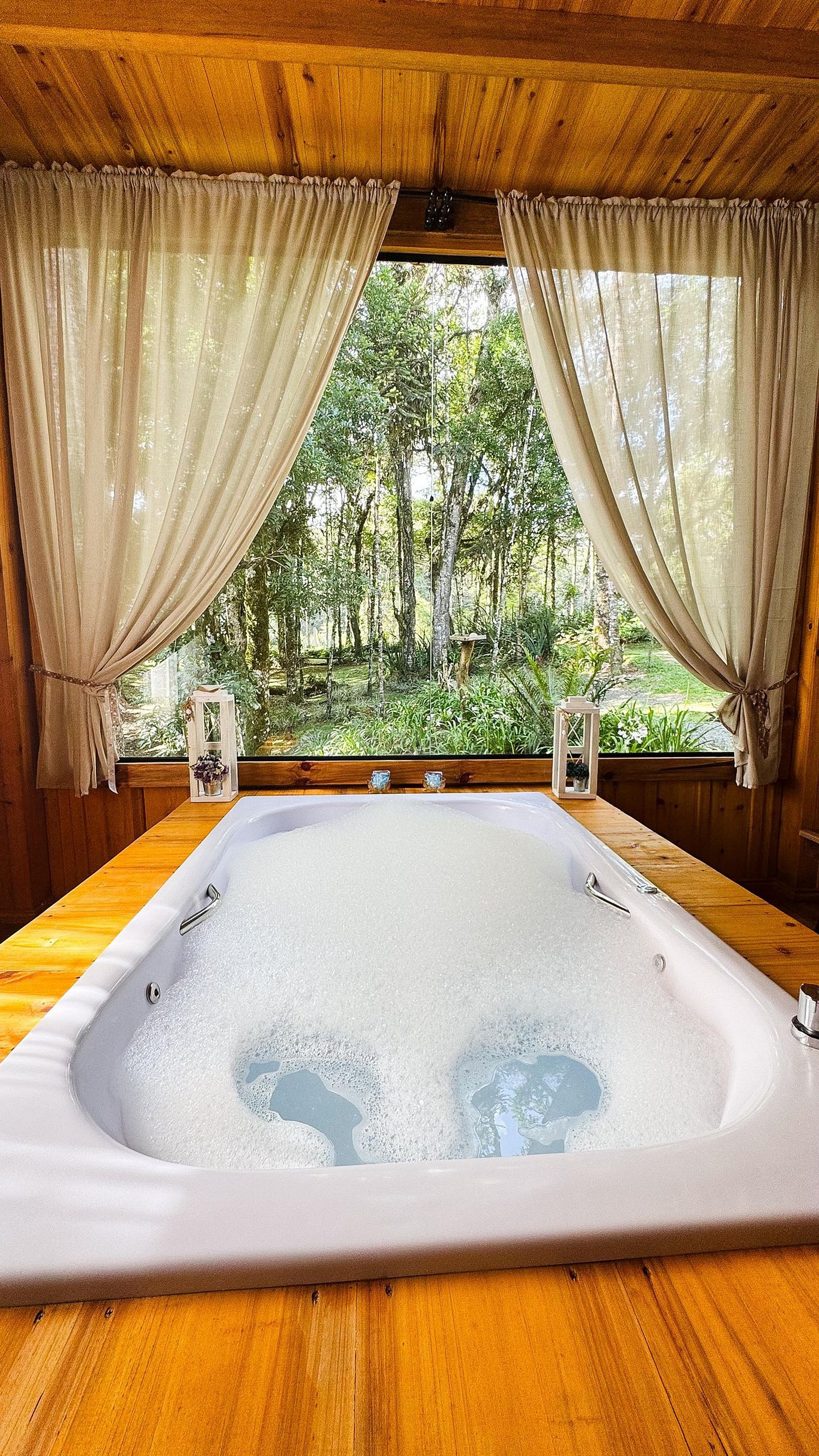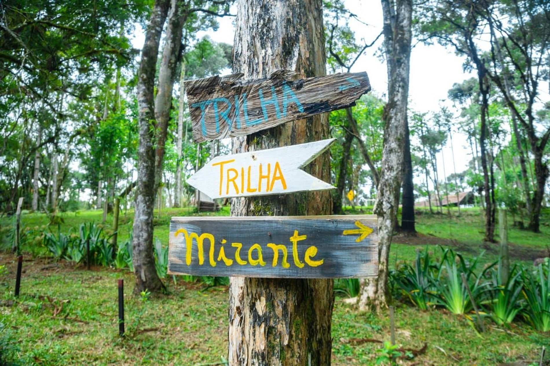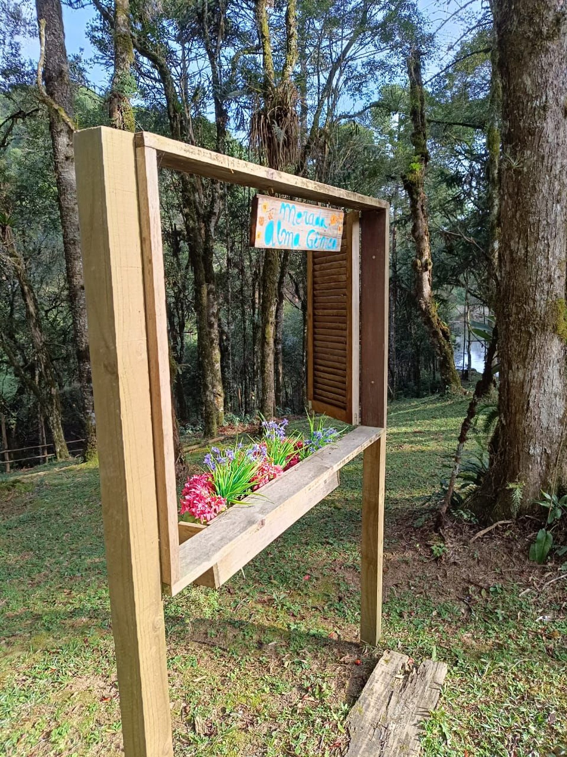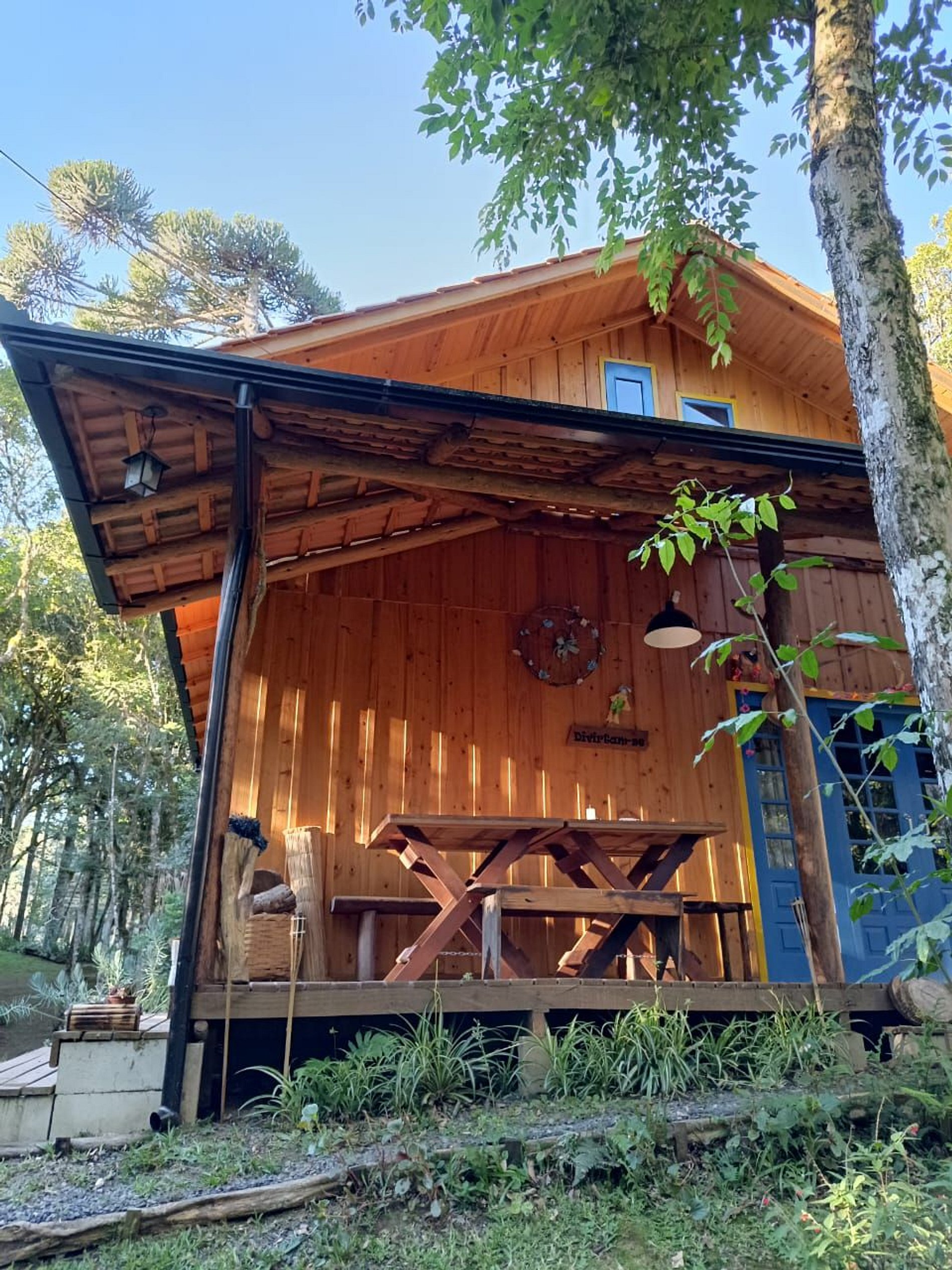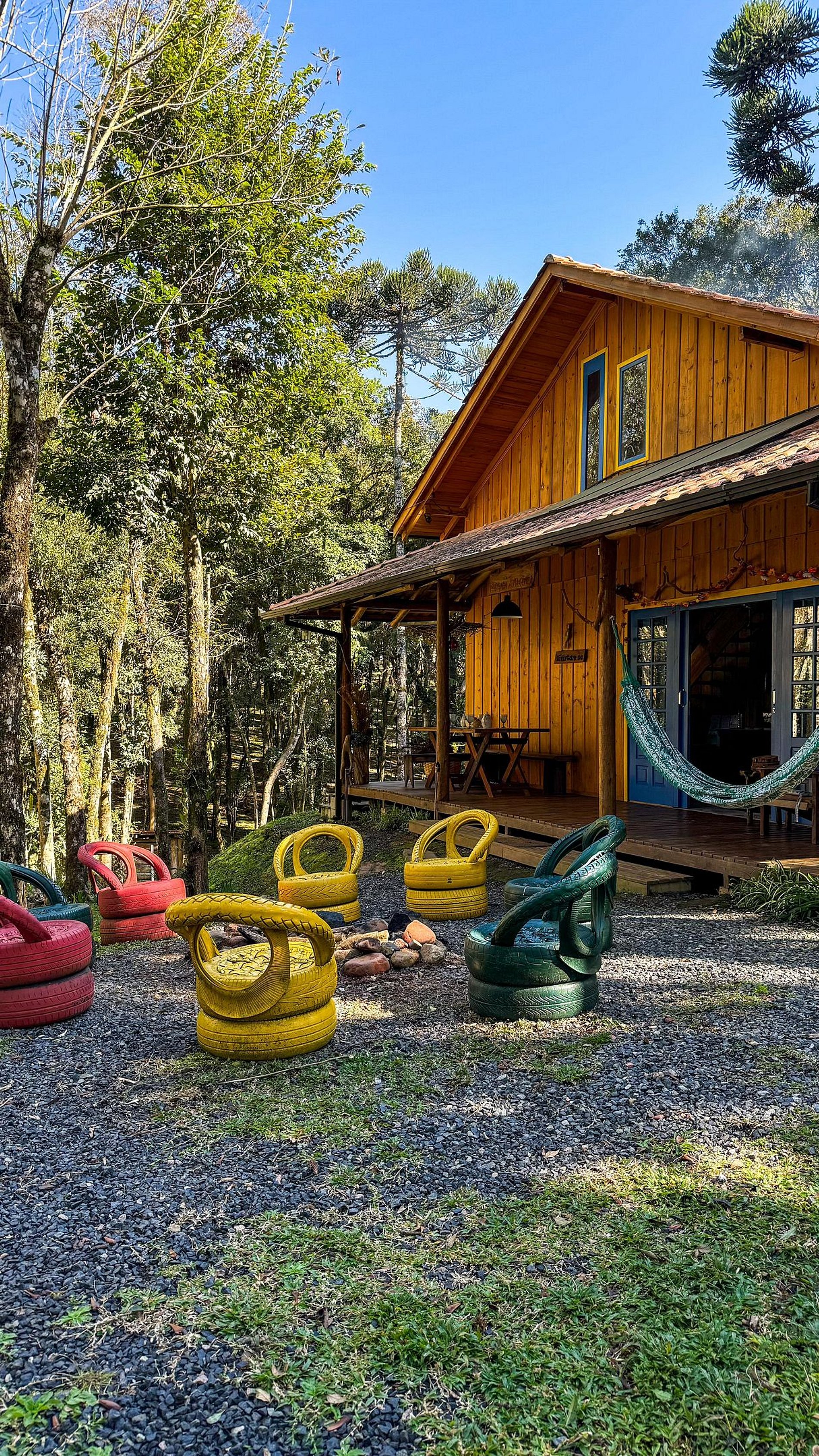 Dois quartos e amplo mesanino. SPA privativo com banheira de hidromassagem. Cozinha completa com churrasqueira e fogão a lenha. Lareira interna e externa. Banheiro completo com ducha a gás e 2 lavabos. Vegetação nativa, araucárias, flora e fauna preservadas. Pomar, balanços, redes, pula-pula, churrasqueira, mesas, áreas para piquenique. Tanque de pesca, pedalinho, bancos, trilhas, casinha na árvore, campinho. Mirante com linda vista para o por do sol.