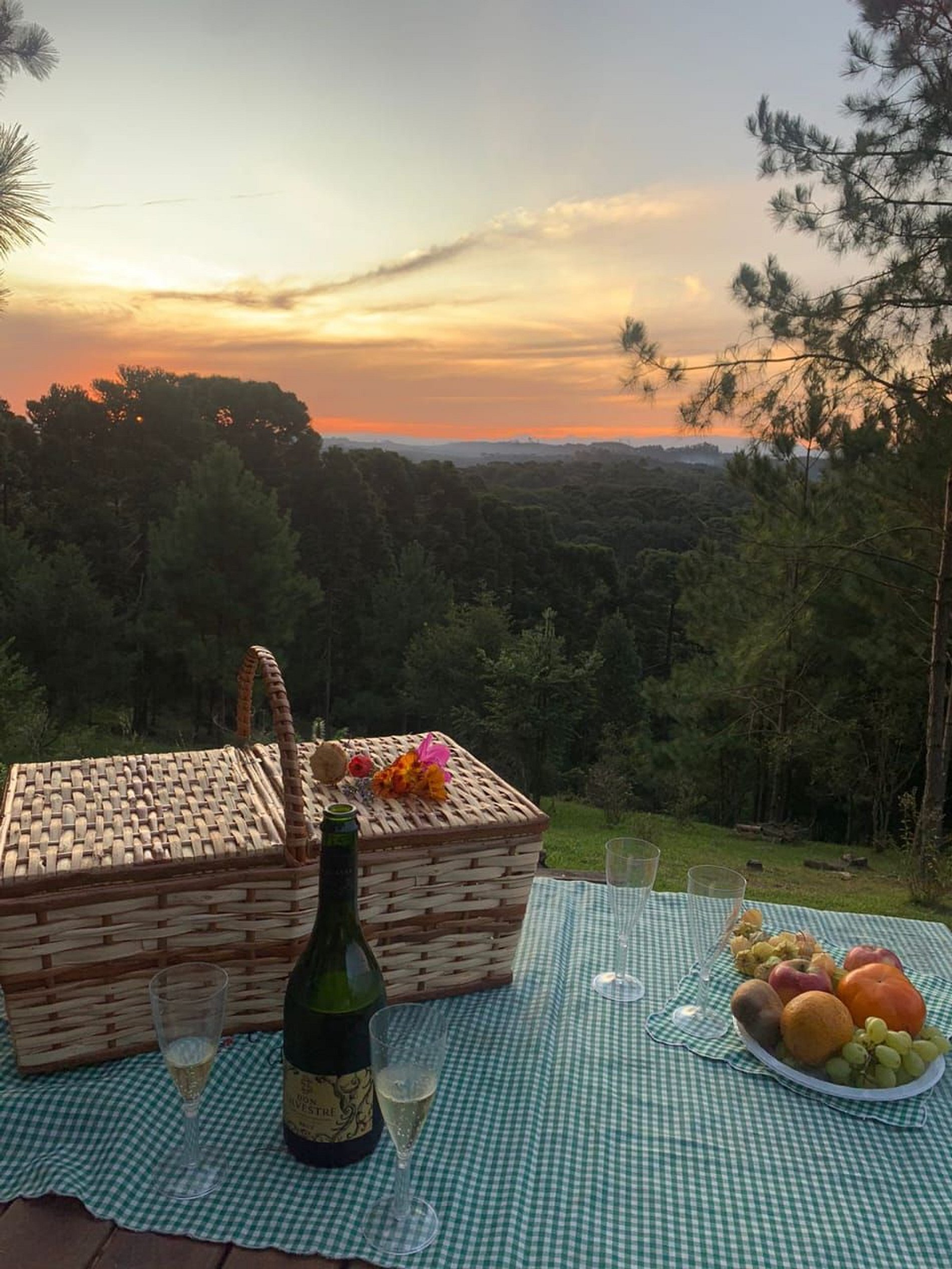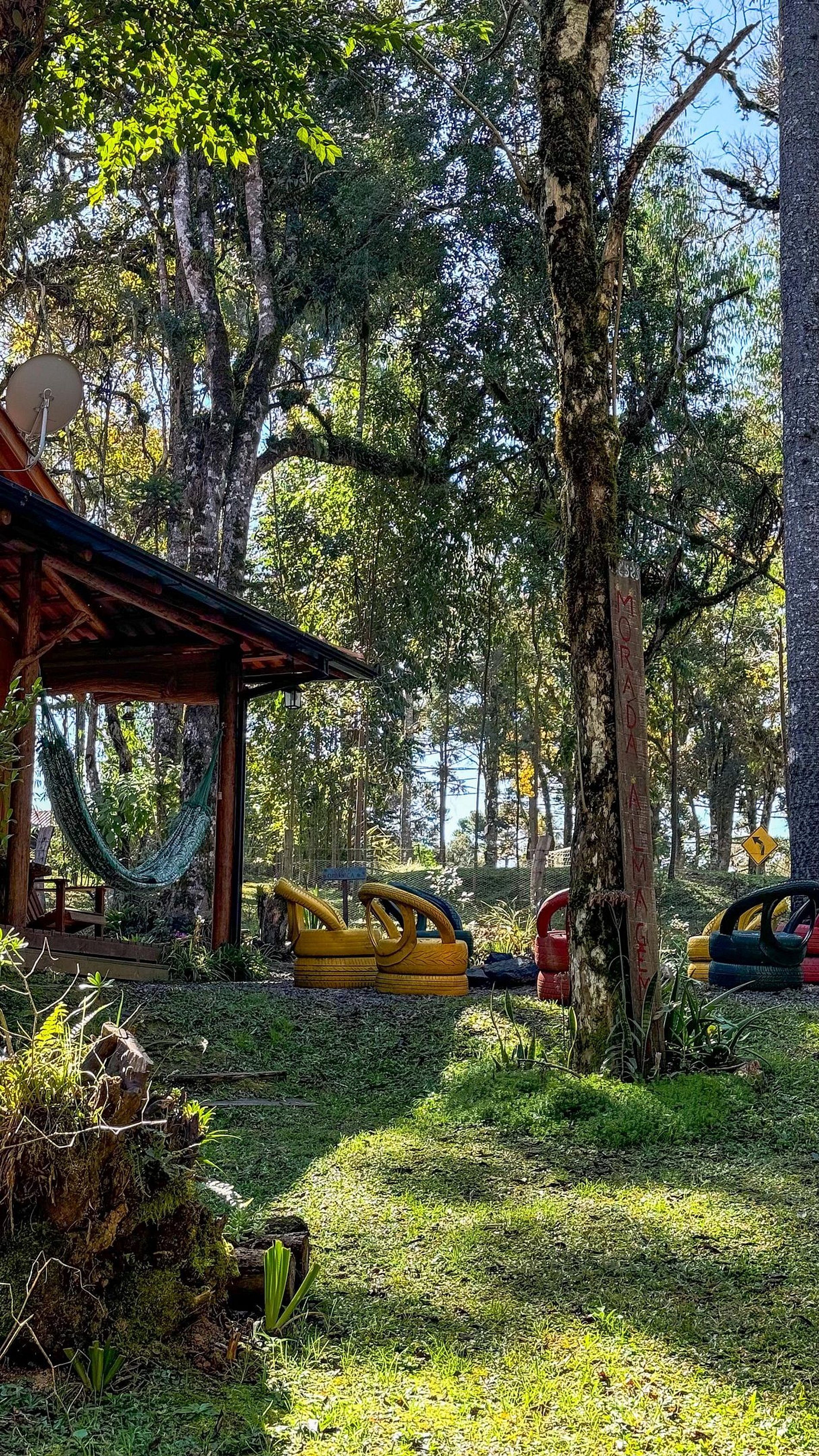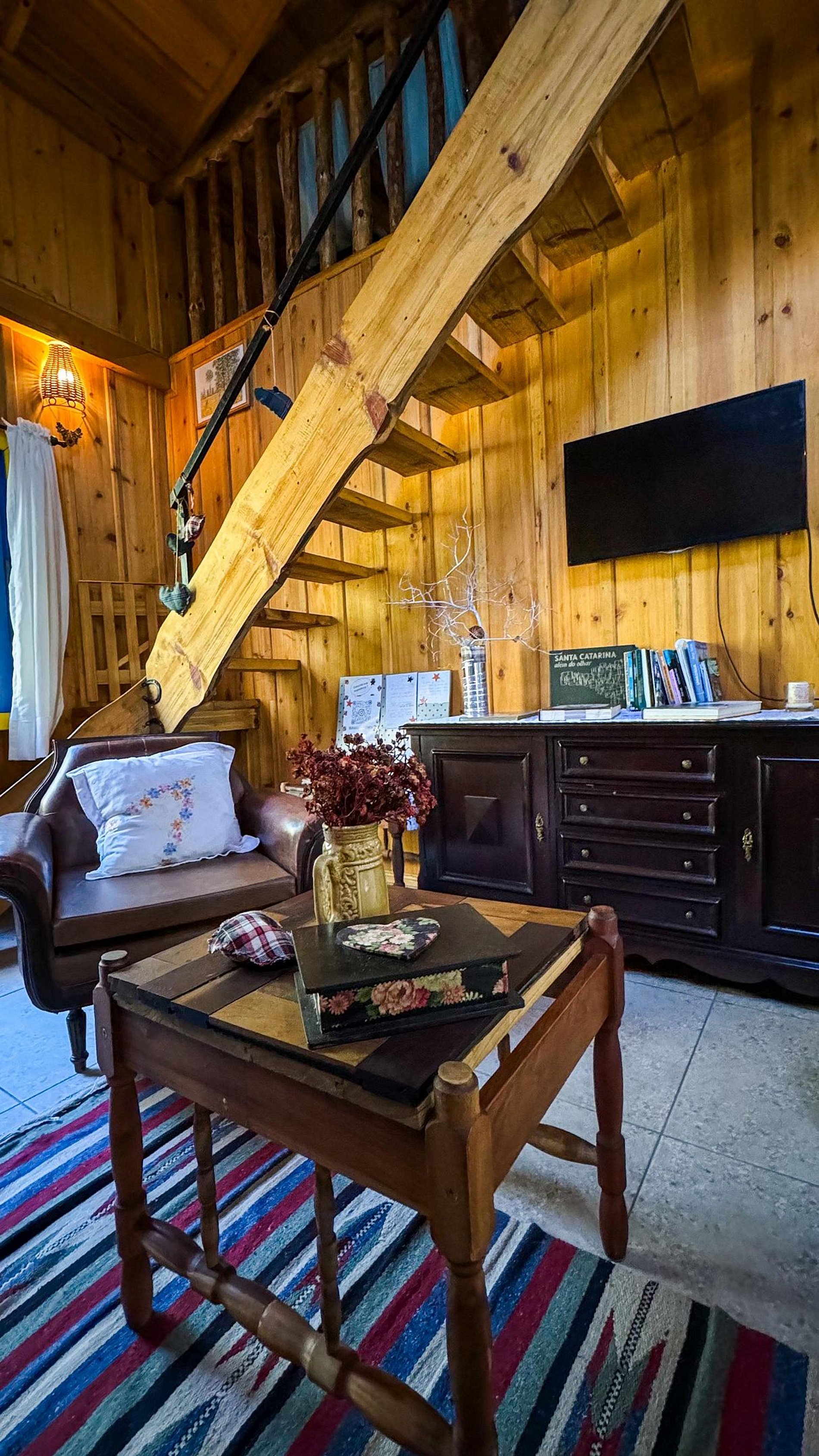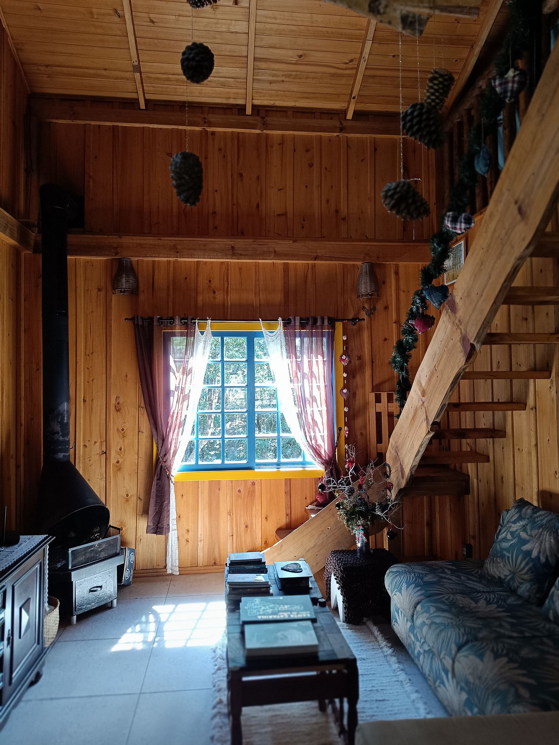 Dois quartos e amplo mesanino. SPA privativo com banheira de hidromassagem. Cozinha completa com churrasqueira e fogão a lenha. Lareira interna e externa. Banheiro completo com ducha a gás e 2 lavabos. Vegetação nativa, araucárias, flora e fauna preservadas. Pomar, balanços, redes, pula-pula, churrasqueira, mesas, áreas para piquenique. Tanque de pesca, pedalinho, bancos, trilhas, casinha na árvore, campinho. Mirante com linda vista para o por do sol.