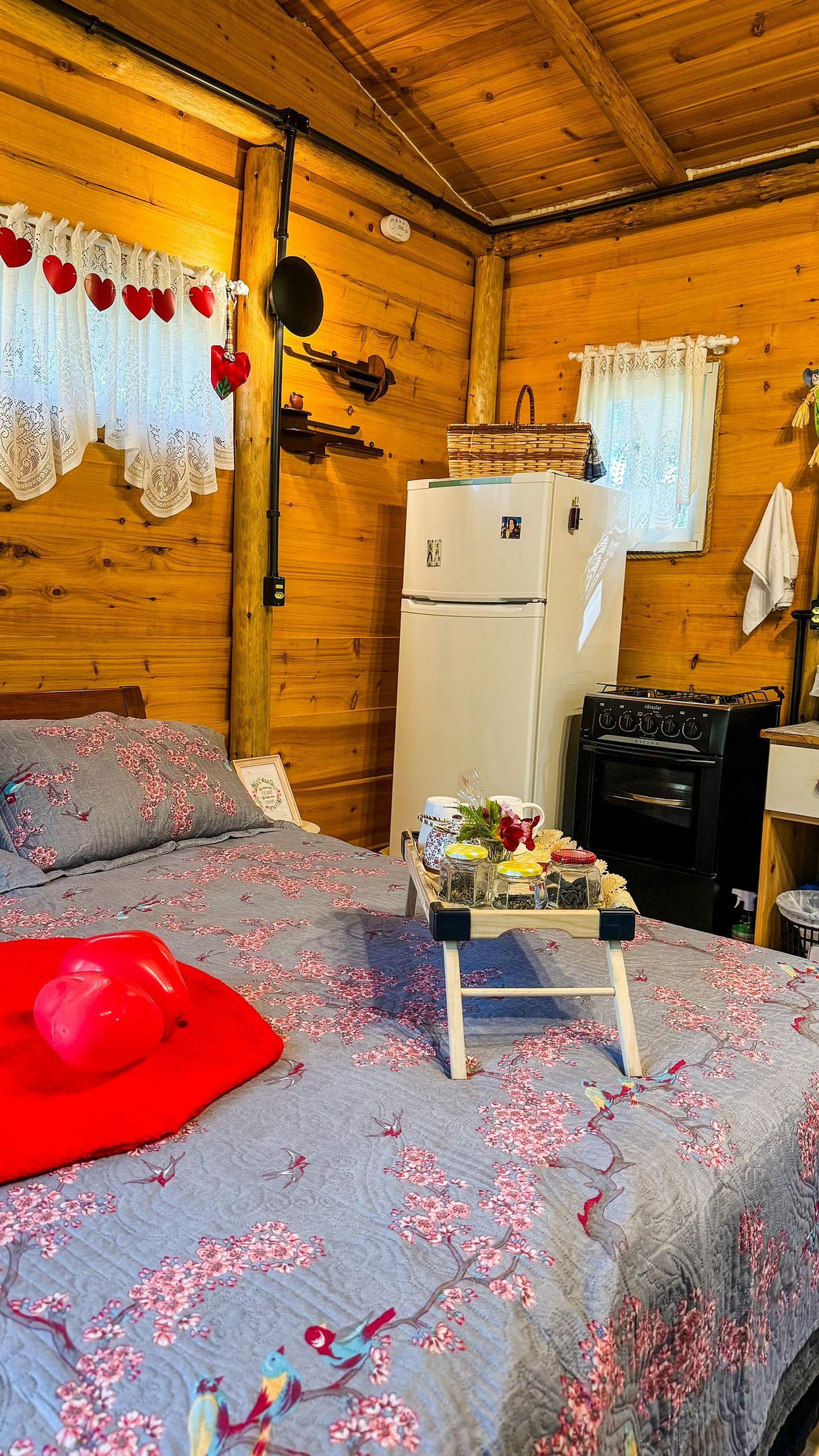 A cabana está pertinho de pontos turísticos e comércio de Campo Alegre, nosso Paraíso da Serra. Está localizada no Distrito de Bateias de Cima, área rural, a 20 km da sede do município. Imersa numa floresta de araucárias e mata nativa, tem tanque para pesca e pedalinho. Um lindo mirante para apreciar o pôr do sol convida para um piquenique, um vinho. Trilhas para caminhadas, balanço e bancos. Lareira de jardim e interna. Chuveiro com ducha a gás.