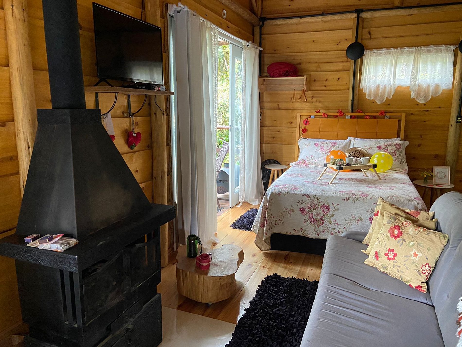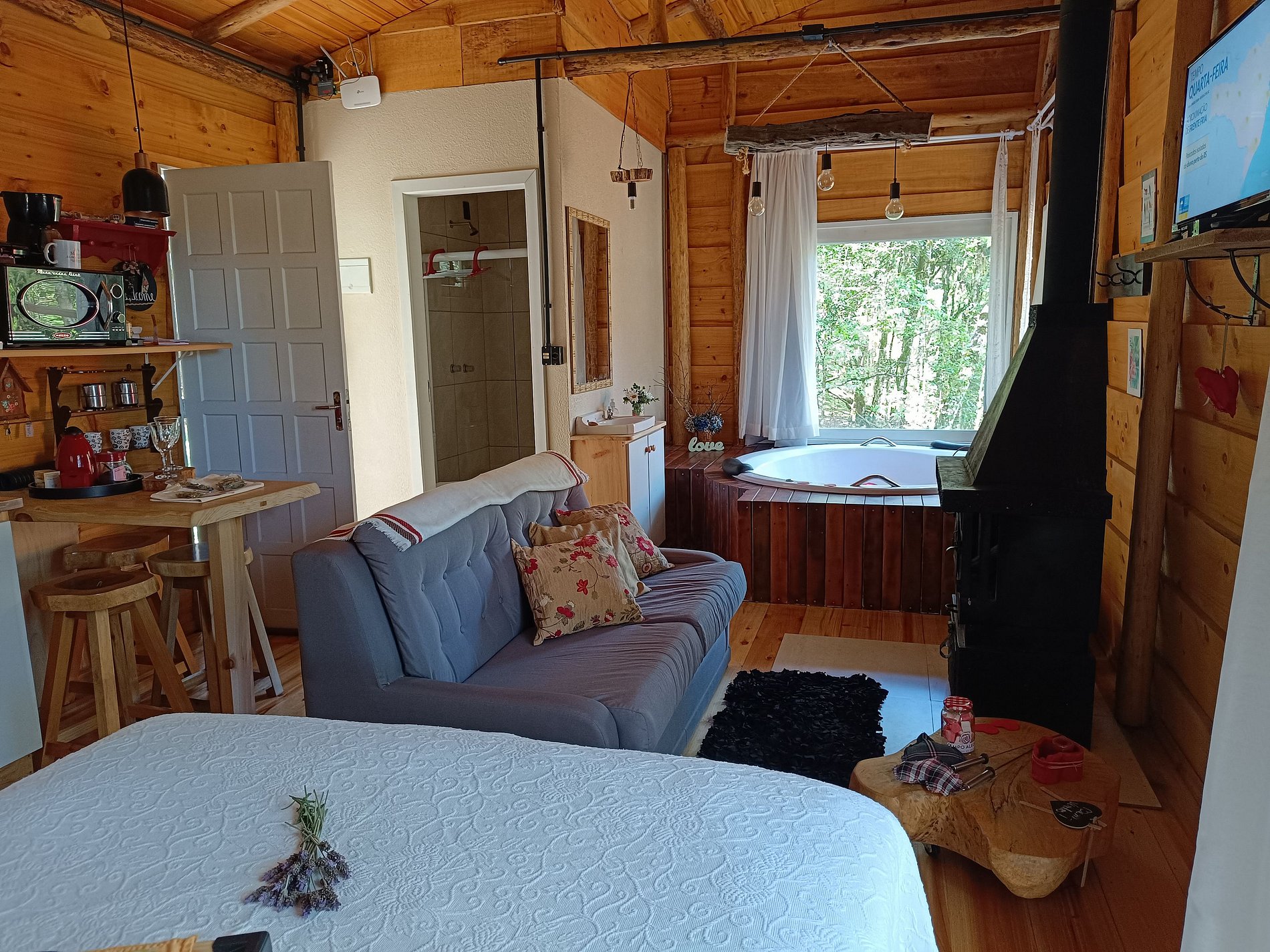 Relaxe neste espaço calmo e cheio de estilo. Cabana confortável no meio do mato, com amplas janelas e varandas. Viva a sensação de estar numa casa na árvore. Planejada para se viver momentos únicos de conexão com a natureza. Você pode caminhar nas trilhas, pescar, andar no pedalinho, curtir o pôr do sol no Mirante da propriedade, fazer um piquenique no déque sobre lago ou simplesmente relaxar imerso na banheira de hidromassagem, na varanda, na cama ou no sofá, se aquecendo nas lareiras. Roupas de cama e banho podem ser solicitadas no ato da reserva, acrescida de taxa extra.