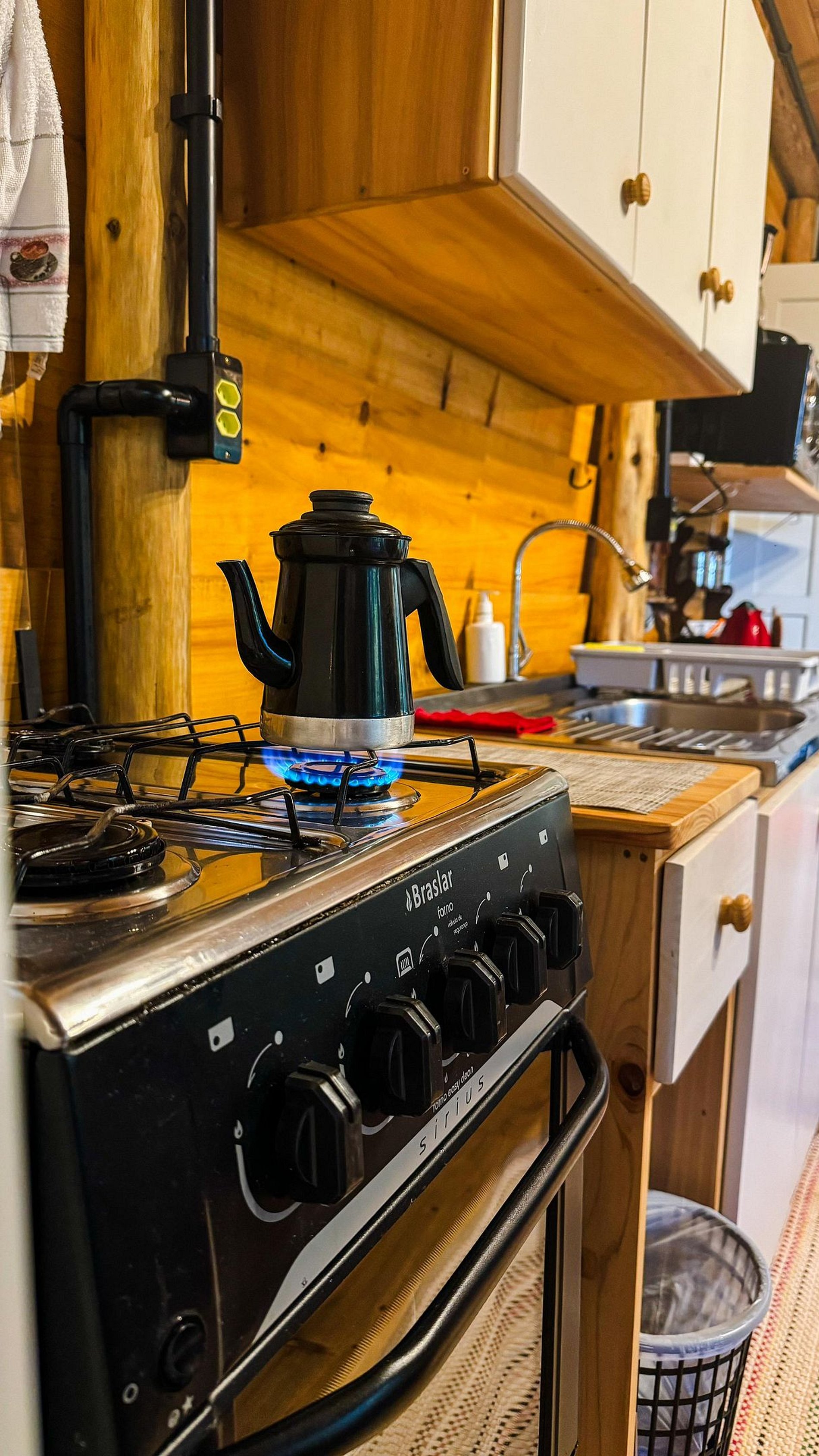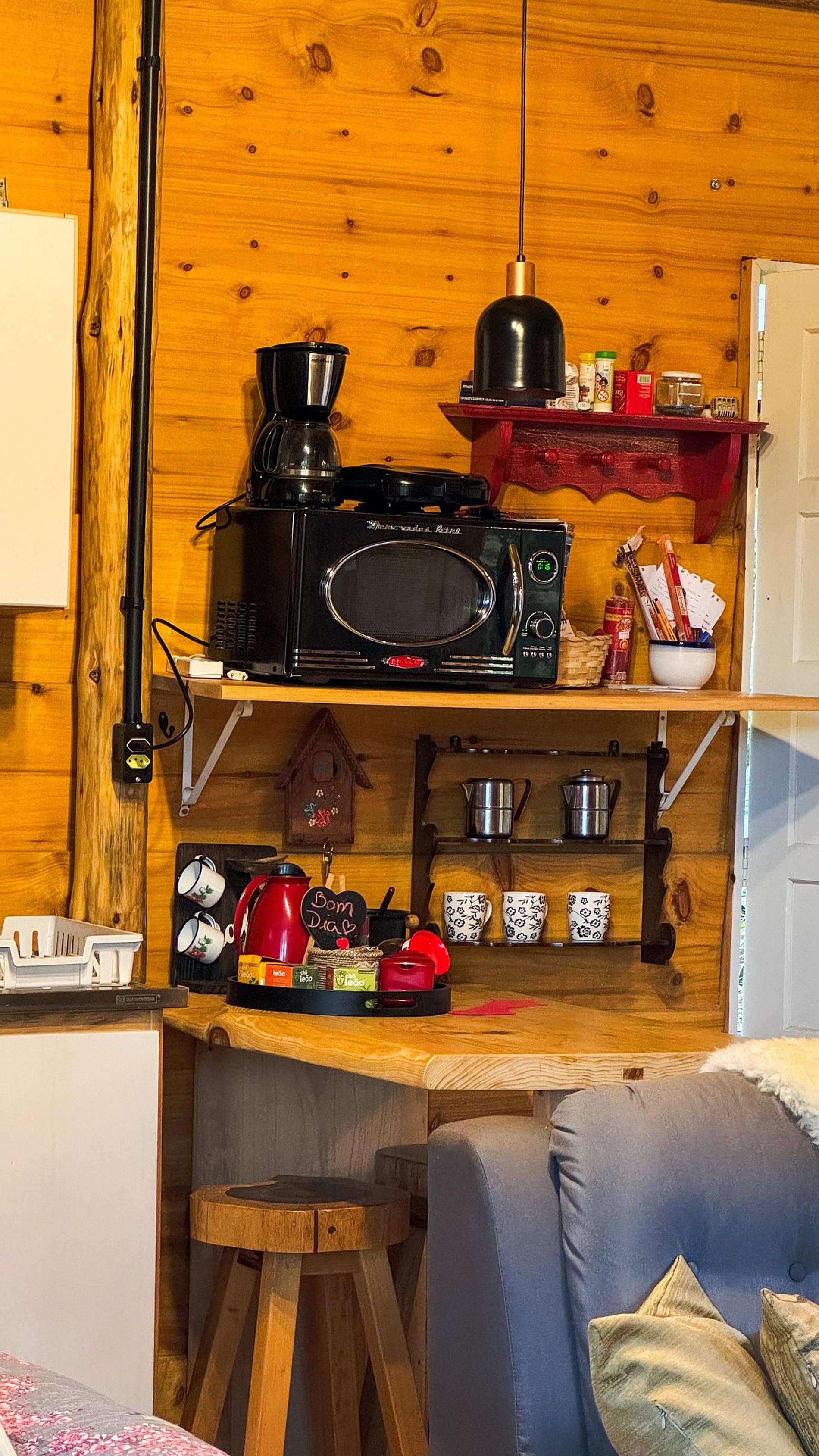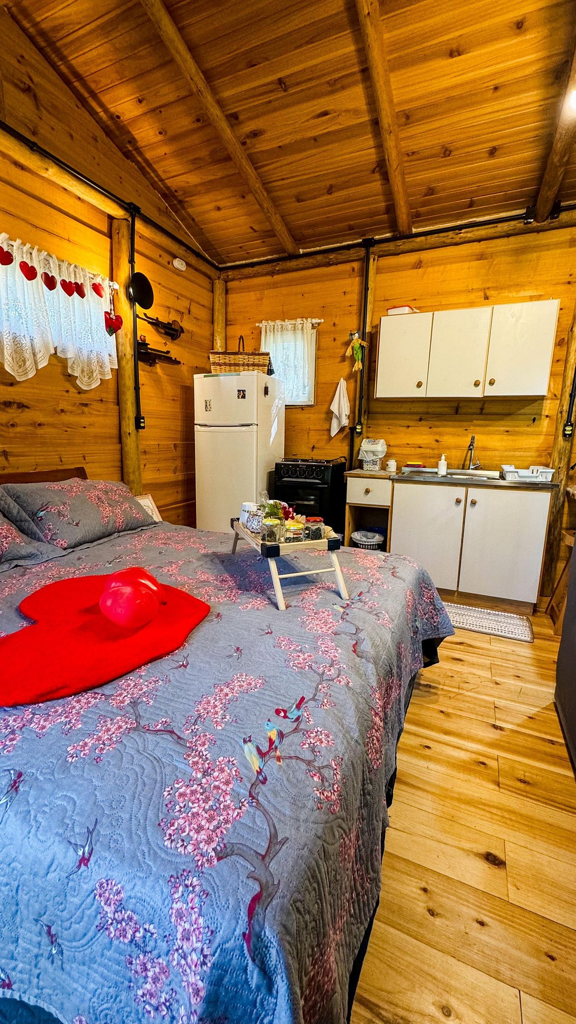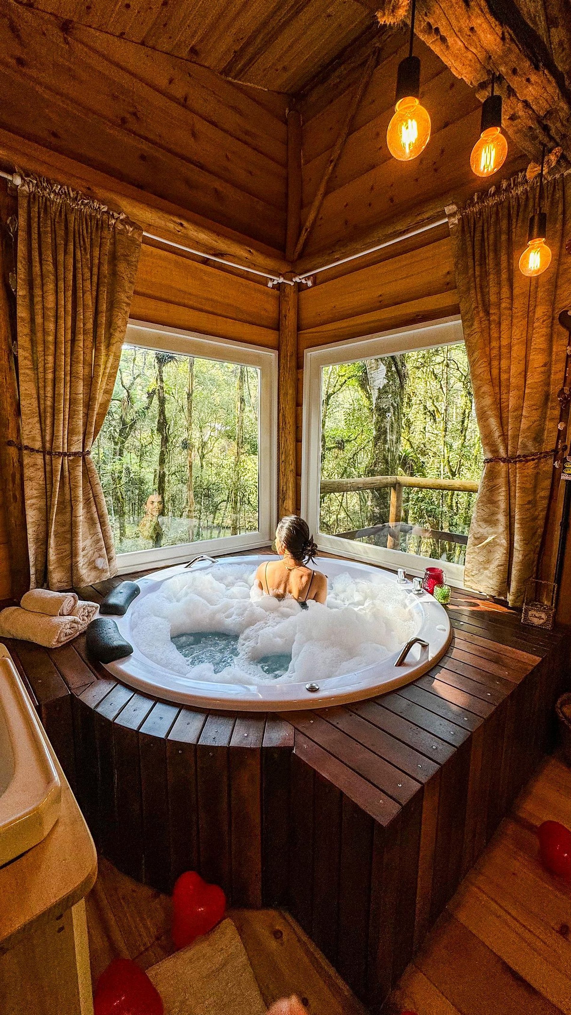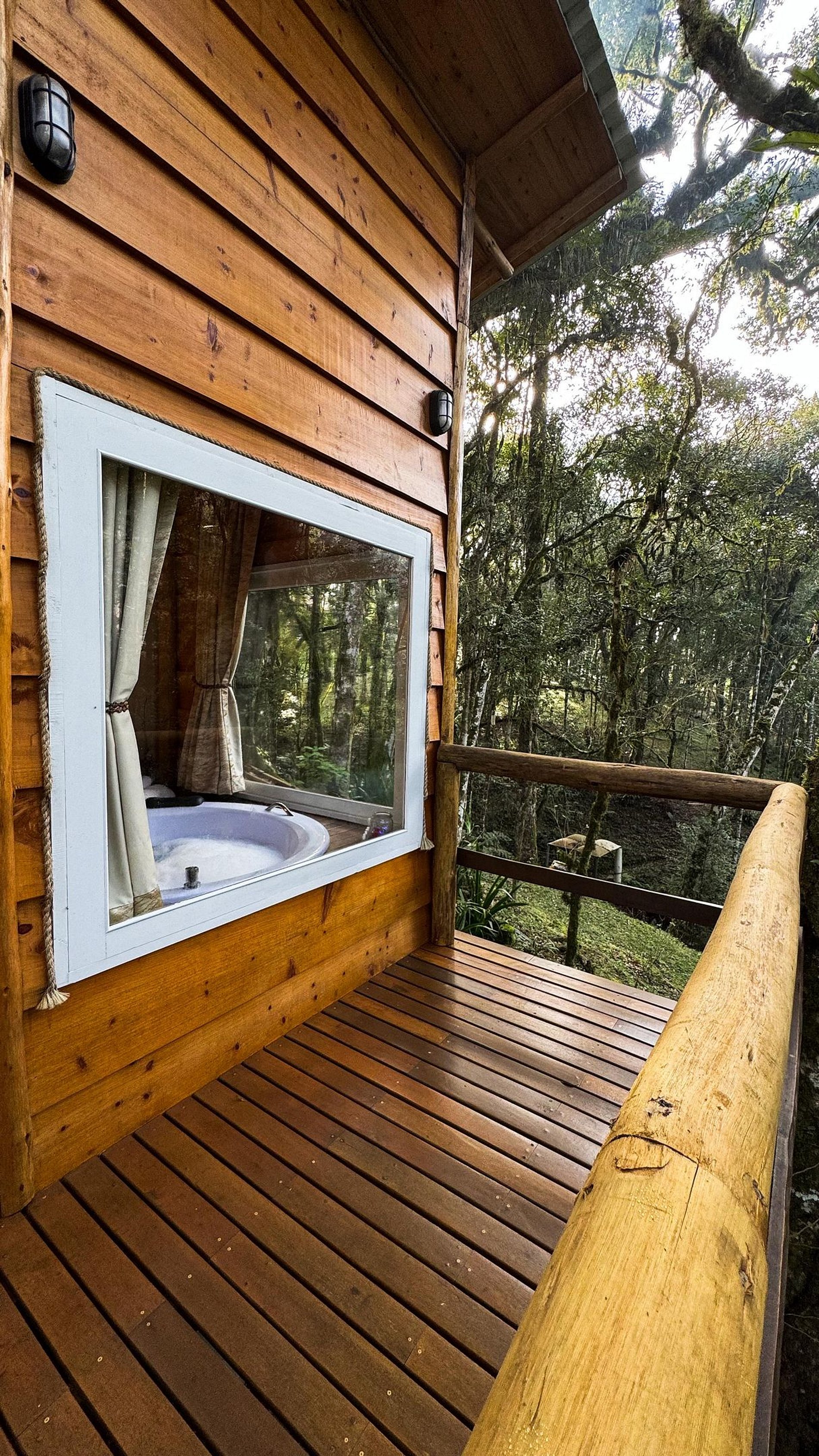 A cabana tem Jacuzzi, lareira e cozinha completa. churrasqueira para uso na varanda ou no bosque. Trilhas, mirante, balanços, mesa e bancos.